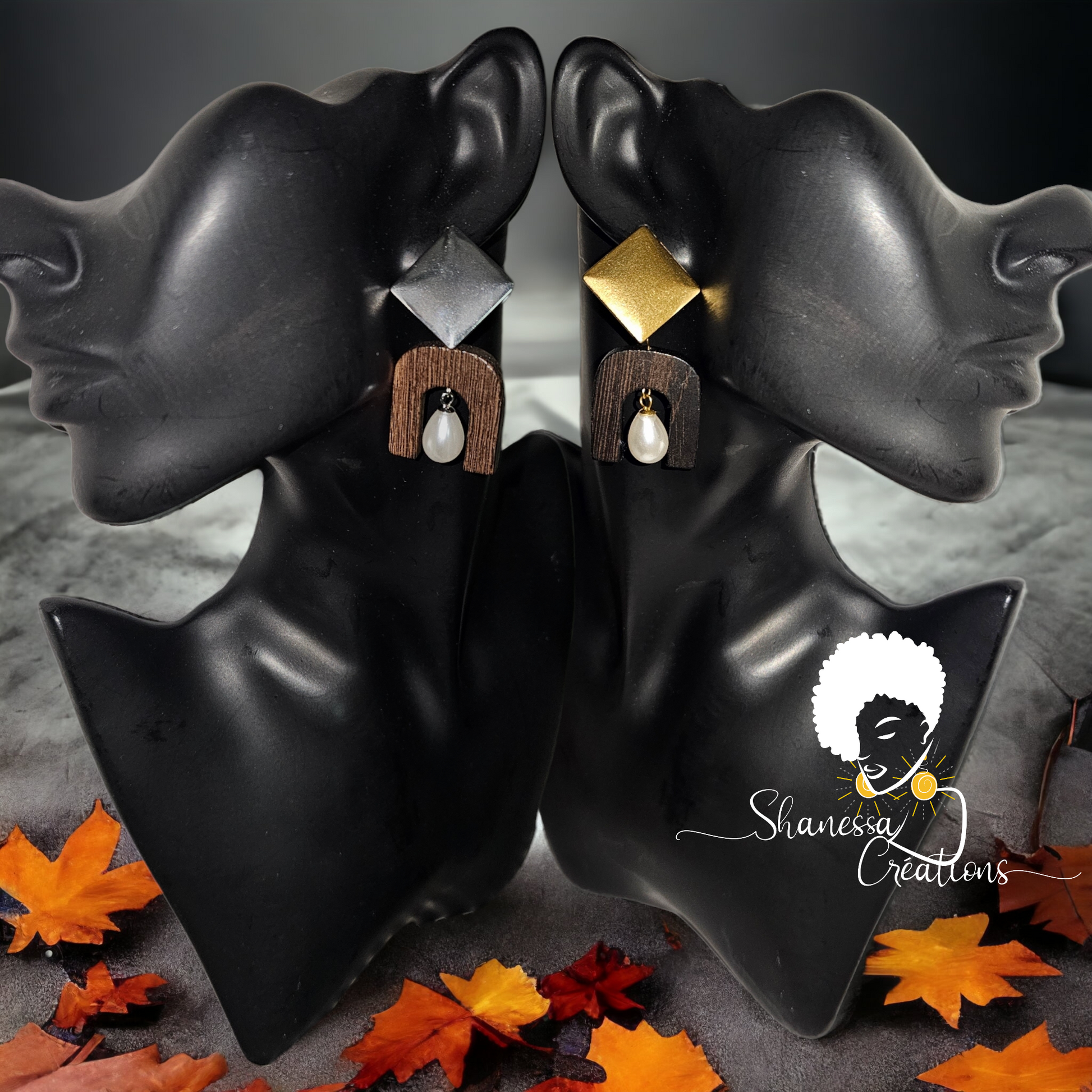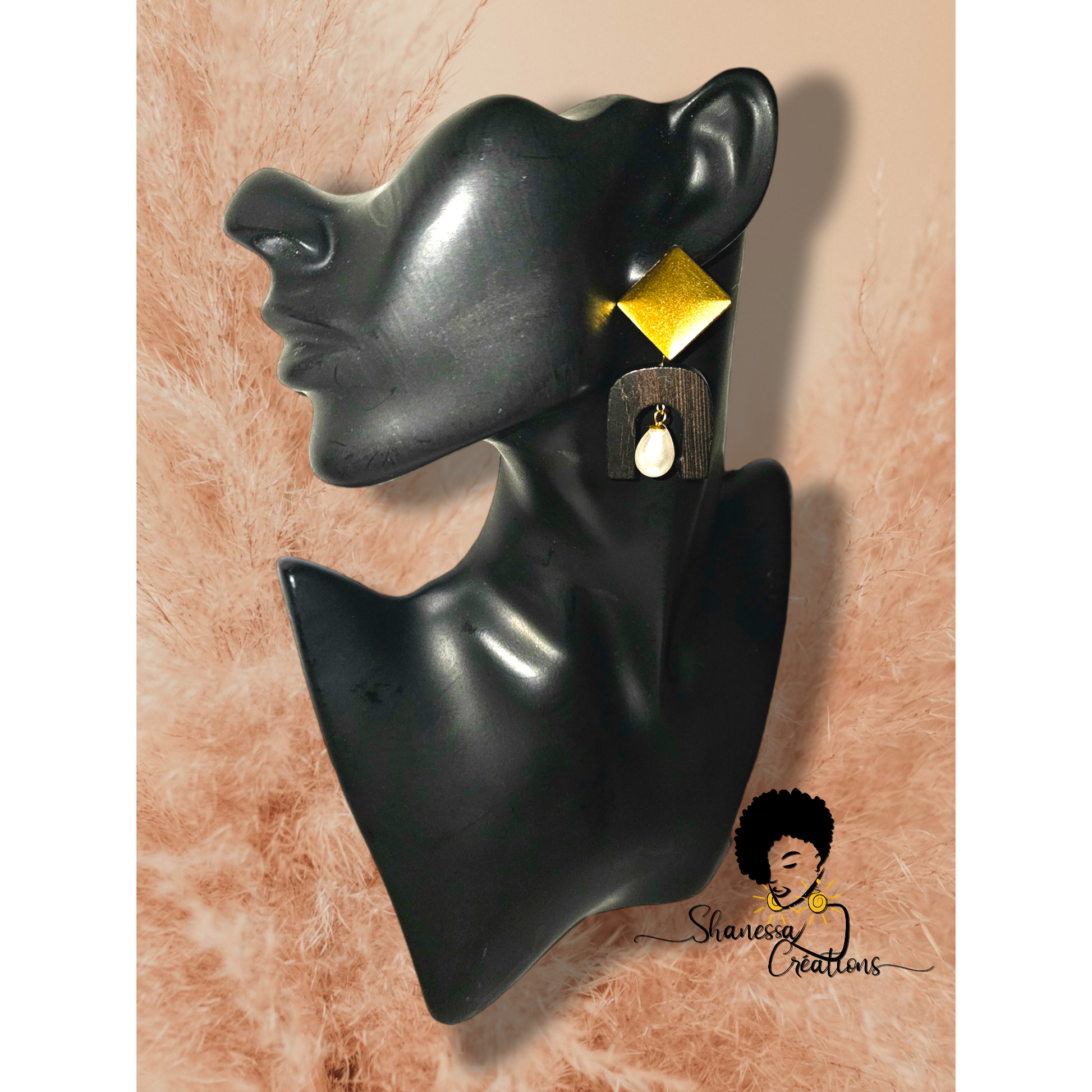 A graphic earring in tune with the times, mixing wood, (fake) cultured pearl and stainless steel.